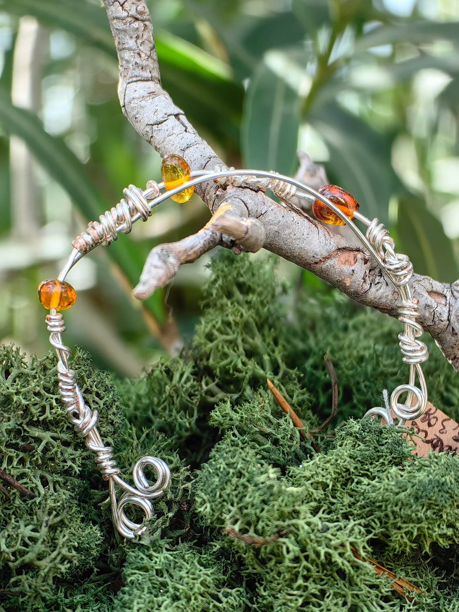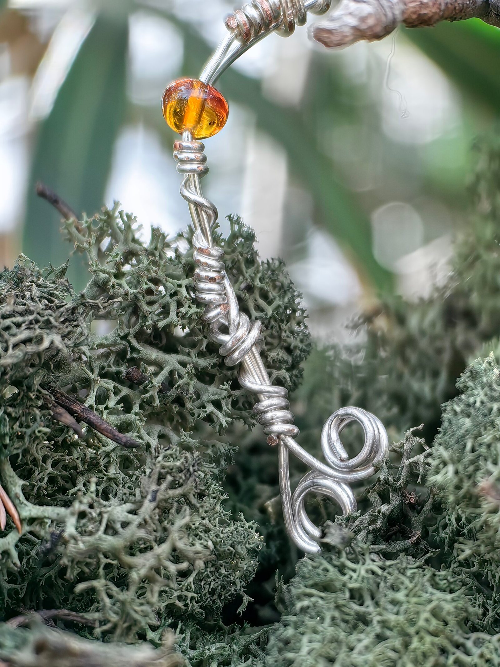 Ses spirales symbolisent le mouvement et la renaissance, tandis que trois perles d’ambre de la mer Baltique apportent une lumière solaire et ancestrale.