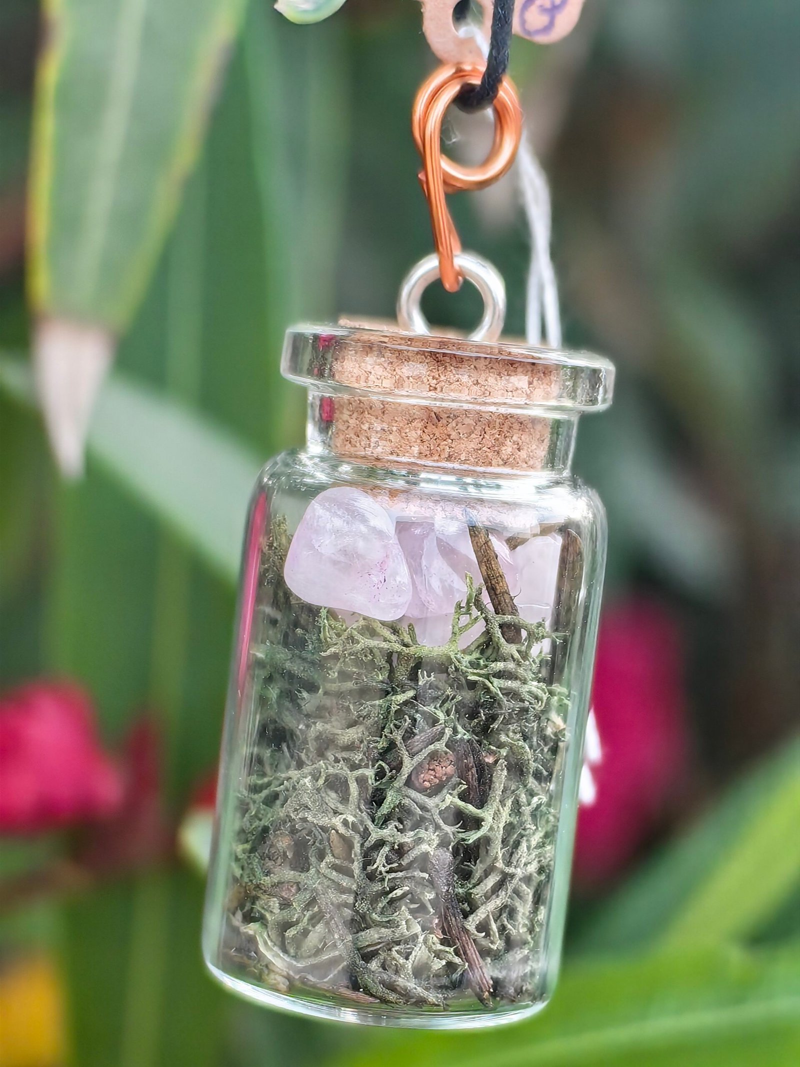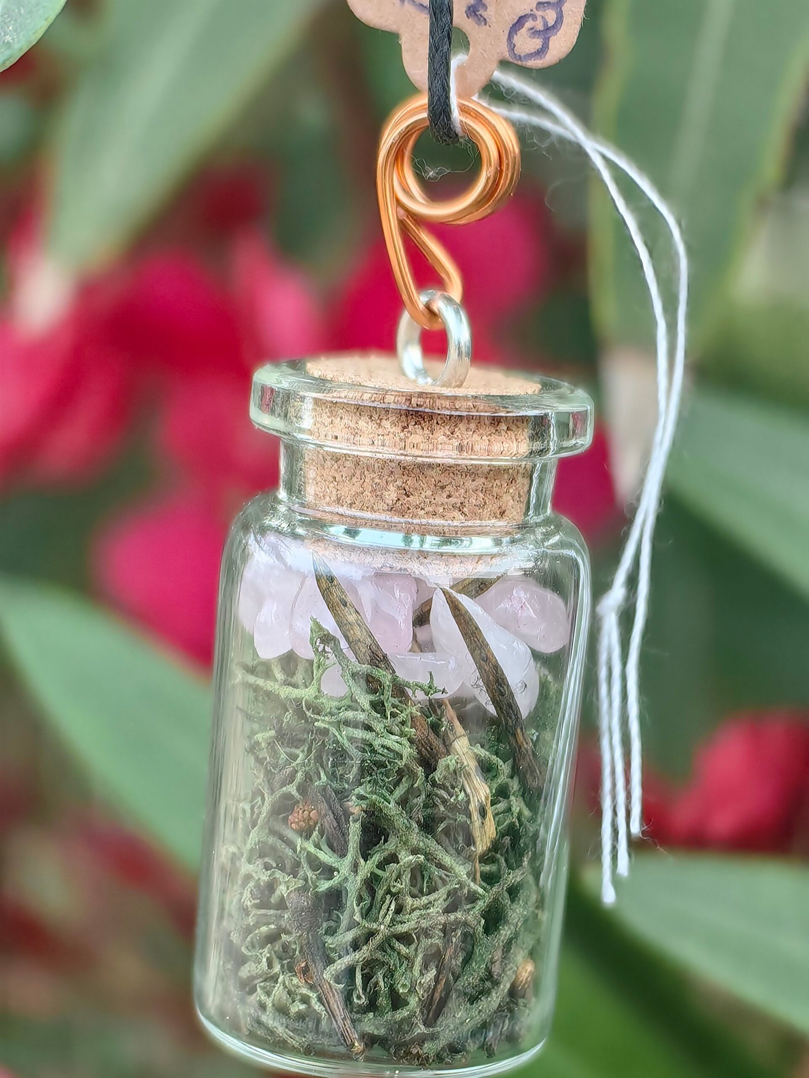 Pendentif grande fiole « Talisman des fées » quartz rose et mousse végétale naturelle monté sur cuivre