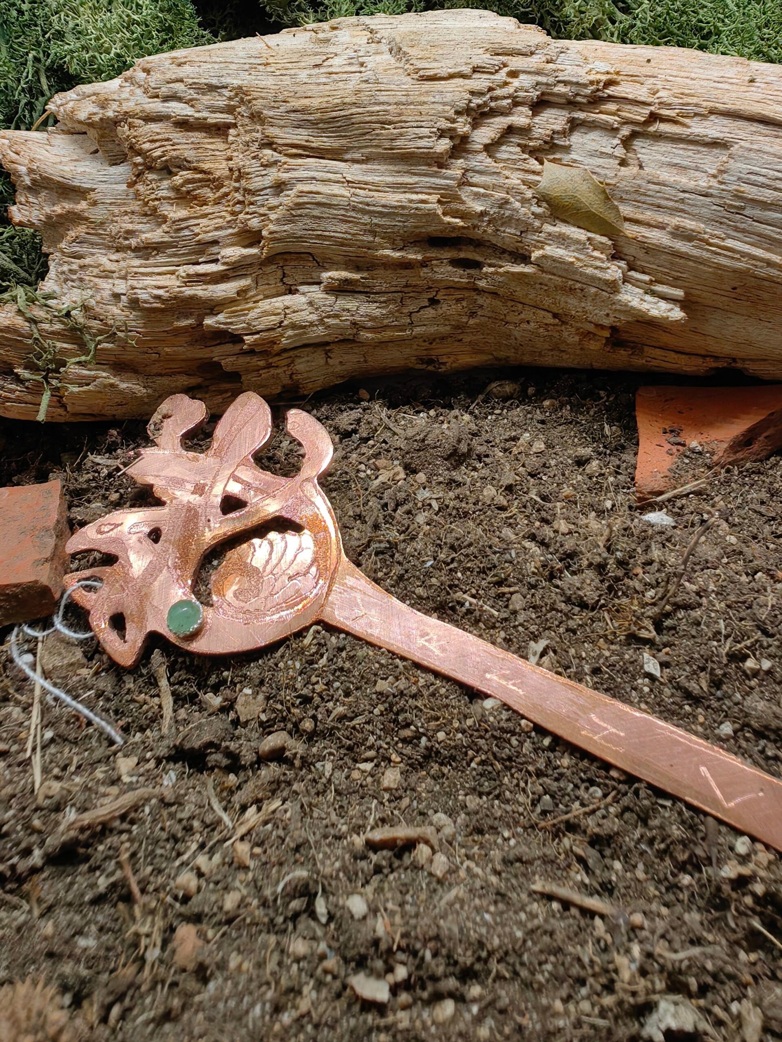 Façonné à la main dans le cuivre et orné d’une aventurine verte sertie d’argent, ce pic à cheveux en style Borre incarne la majesté du paon, messager d’immortalité et gardien des secrets anciens.